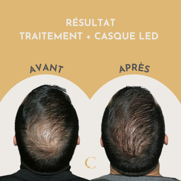 Après des séances de lampes et casques LED on observe une meilleure densité capillaire, davantage de repousse et un ralentissement de la perte de cheveux.